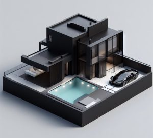 ۱. معماری مدرن و هندسی: ساختار مکعبی و خطوط شدید این خانه با استفاده از اصول معماری مدرن و مینیمالیسم